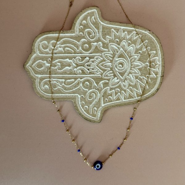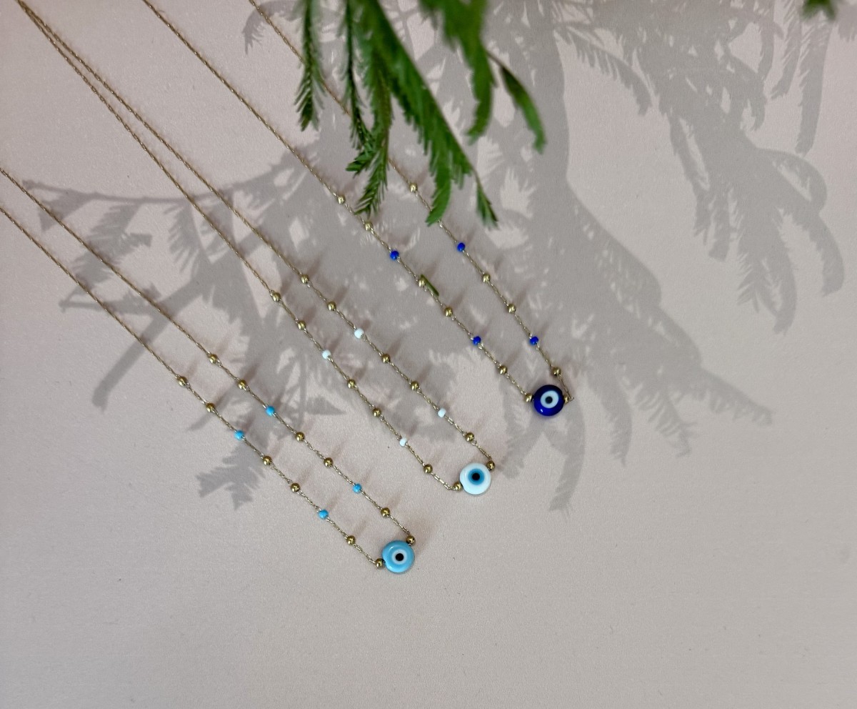 Un collar delicado en acero dorado, con pequeñas perlas Miyuki y un ojo turco central, símbolo de protección y buena energía.